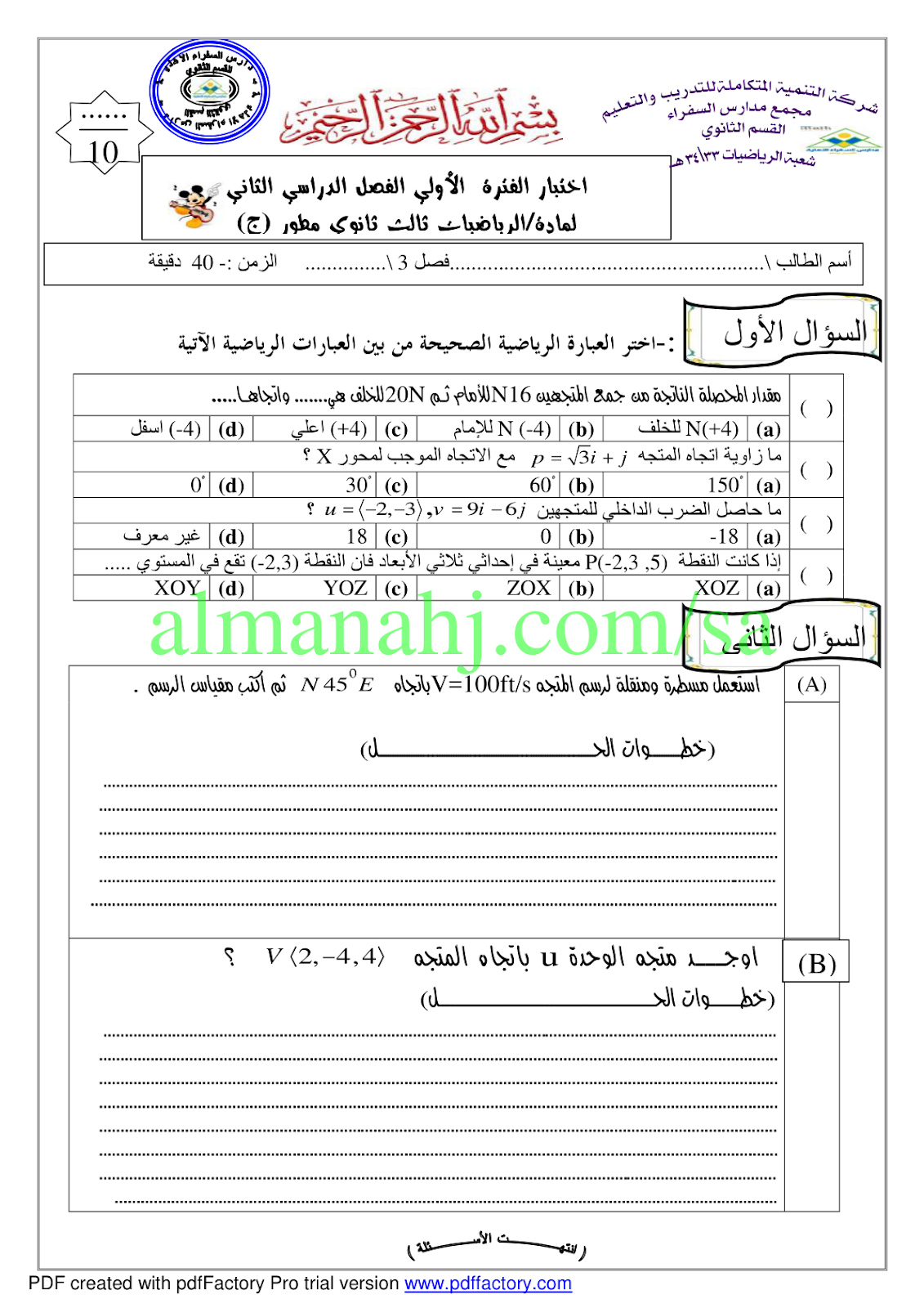 معلومات الملف: إليكم ملف هام يتضمن اختبار الفترة الأولى 2 في مادة الرياضيات للصف الثالث الثانوي وفق المنهج السعودي | ||