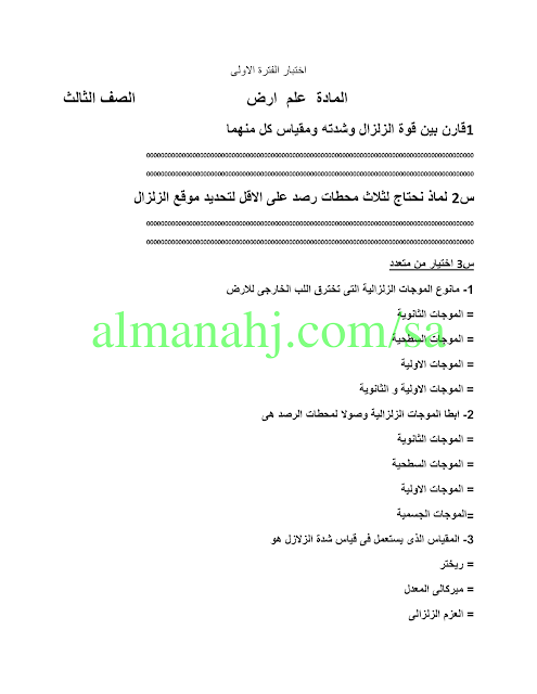 معلومات الملف: إليكم نموذج اختبار ثالث في مادة علم الارض للصف الثالث الثانوي وفق المنهج السعودي | ||