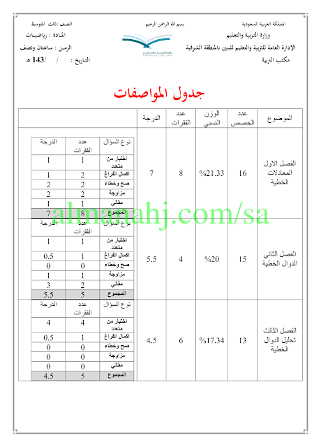 معلومات الملف: إليكم ملف هام يتضمن جدول المواصفات لمادة الرياضيات للصف الثالث متوسط وفق المنهج السعودي | ||