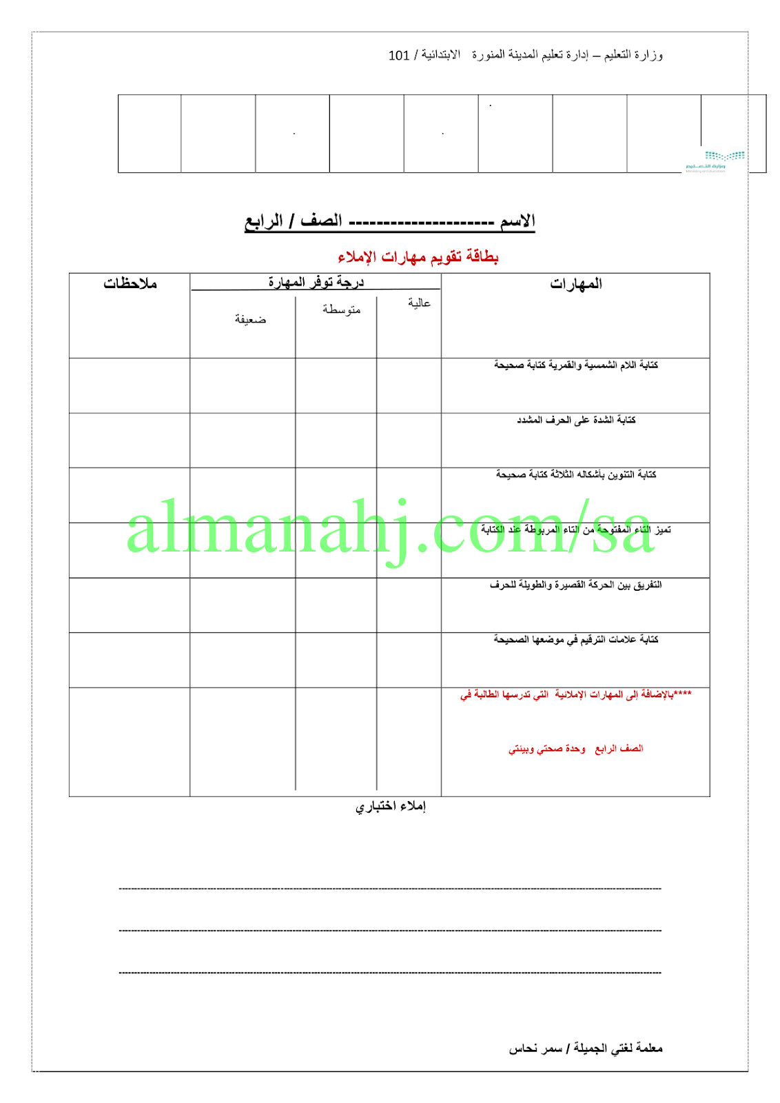ملف هام ورائع في مادة اللغة العربية يتضمن النصوص الإملائية للوحدة الاولى من المقرر (صحتي وبيئتي) يتضمن شروحات والكفايات المستخدمة لهمزتي القطع والوصل والتاء المربوطة والمفتوحة وبطاقة تقويم في نهاية الملف