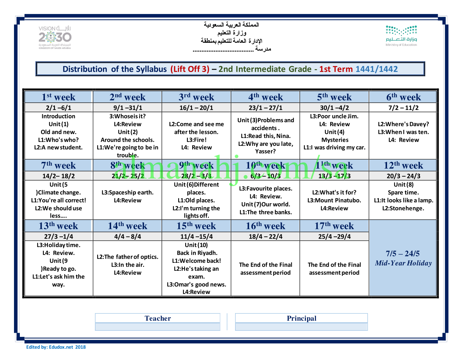 إليكم توزيع منهج لغة انجليزية Lift Off للصف الثاني متوسط
