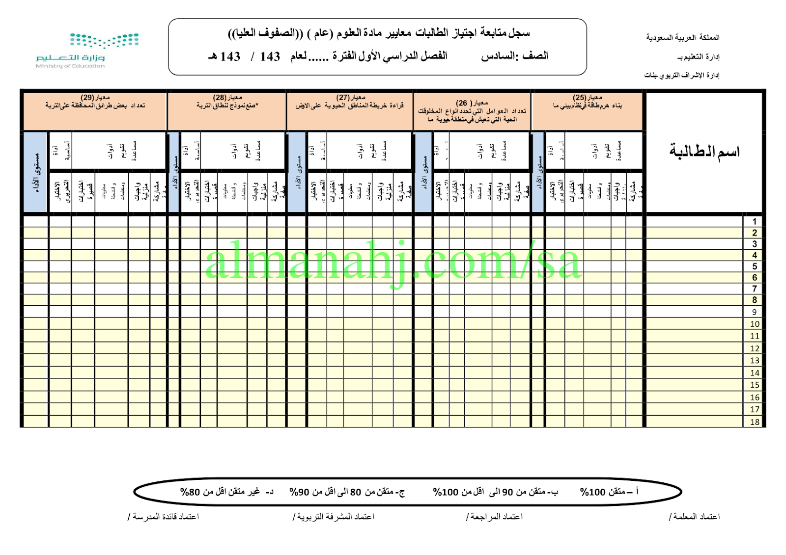 إليكم سجل متابعة اجتياز الطالبات معايير مادة العلوم للصف السادس الابتدائي الفصل الدراسي الأول