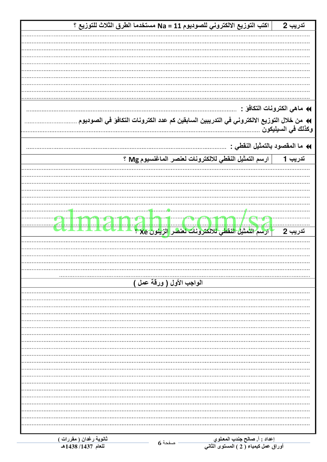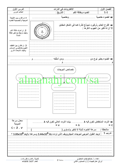 معلومات الملف: إليكم ملف هام يتضمن أوراق عمل في مادة الكيمياء المستوى الثاني للصف الأول الثانوي | ||