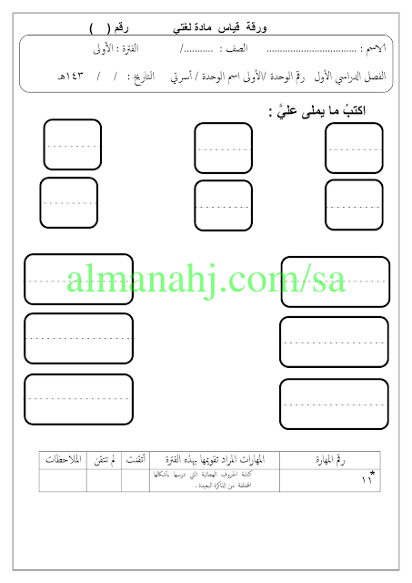 ورقة قياس لغتي اكتب مايملى عليك من الذاكرة البعيدة من الوحدة الأولى /أسرتي /للصف الأول الابتدائي الفصل الدراسي الأول