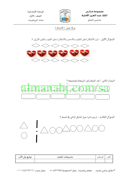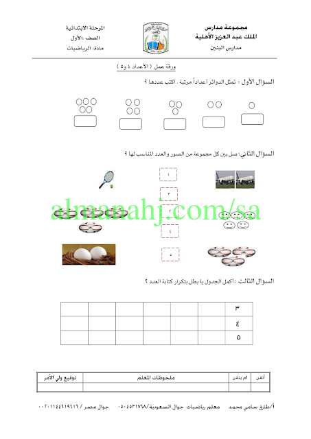 معلومات الملف: إليكم أوراق عمل هامة في مادة الرياضيات للصف الأول الابتدائي الفصل الدراسي الأول | ||