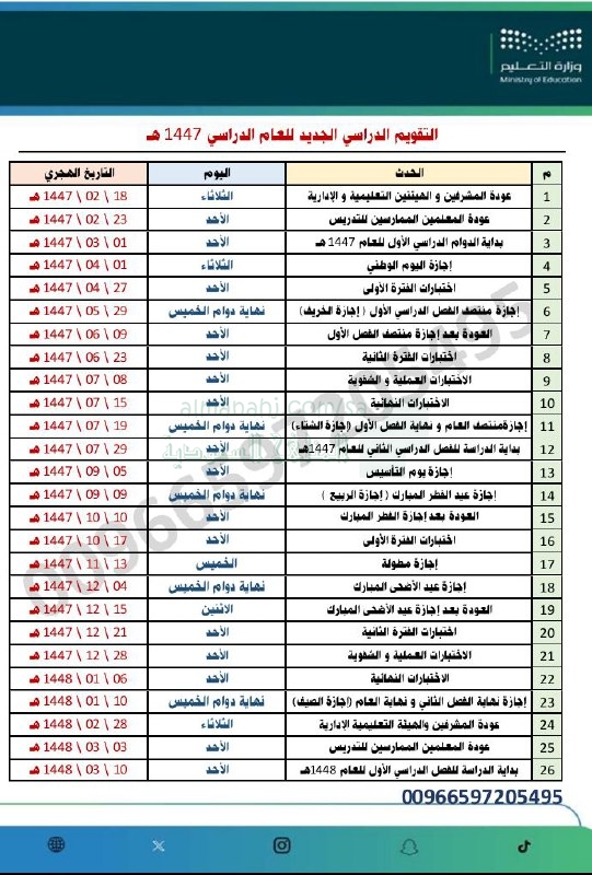 معلومات الملف: ،دليل شامل لمواعيد الدراسة و الإجازات للعام الدراسي القادم 1447ه/1448ه ، بعد إقرار مجلس الوزراء فصلين دراسيين لمدارس التعليم العام للعام الدراسي القادم: | ||
