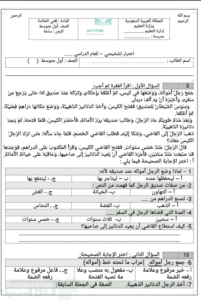 معلومات الملف: أسئلة الاختبار التشخيصي في لغتي الخالدة للفصل الأول 1447ه‍