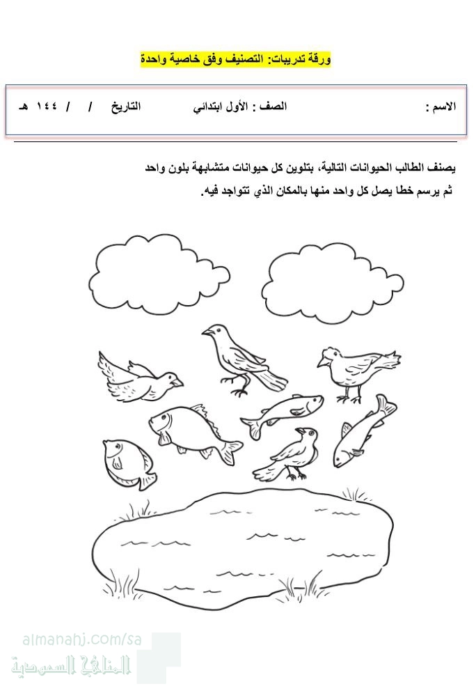 حيث يطلب من الطالب تصنيف الحيوانات المرسومة بتلوين المتشابهة منها بلون واحد ثم يصل بين صورة الحيوان ومكان تواجده