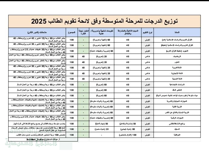 توزيع درجات المواد للمرحلة المتوسطة وفق لائحة تقويم الطالب 2025