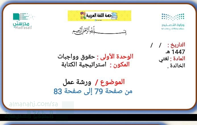 معلومات الملف: عرض بوربوينت ورشة عمل للوحدة الأولى من مقرر لغتي الخالدة للفصل الأول 1447ه‍ حقوق و واجبات استراتيجية الكتابة