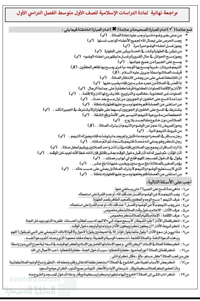 مراجعة نهائية لمنهج الدراسات الإسلامية للفصل الأول 1447ه‍ مع الحل