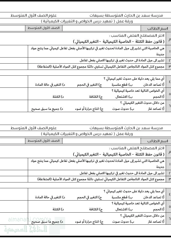أنت هنا: موقع المناهجالمناهج السعودية الصف الأول المتوسط علوم الفصل الأول أوراق عمل