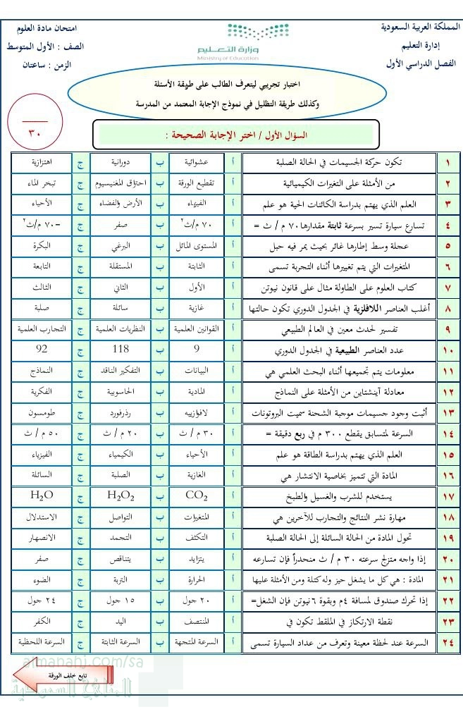 معلومات الملف: نموذج اختبار تجريبي لمادة العلوم ليتعرف الطالب على طريقة الأسئلة و طريقة التظلبل في نموذج الإجابة المعتمد في المدارس