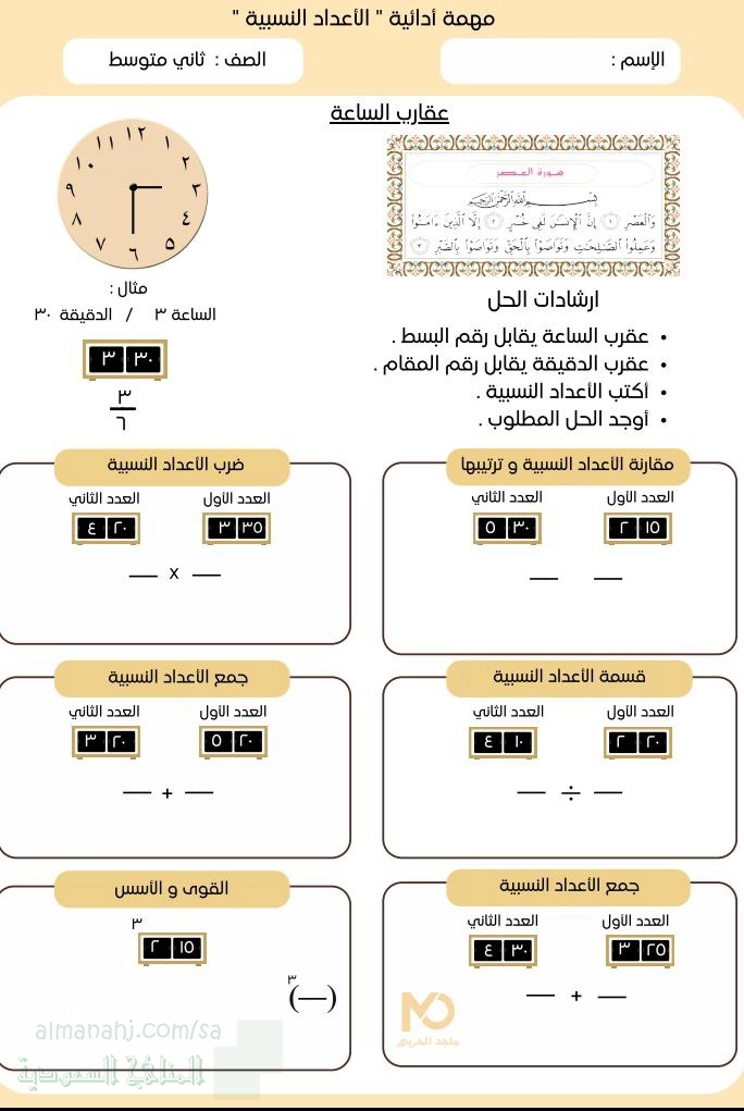 معلومات الملف: المهمة الأدائية للفصل الأول من المقرر للعام 1447ه‍ الأعداد النسبية بعنوان عقارب الساعة