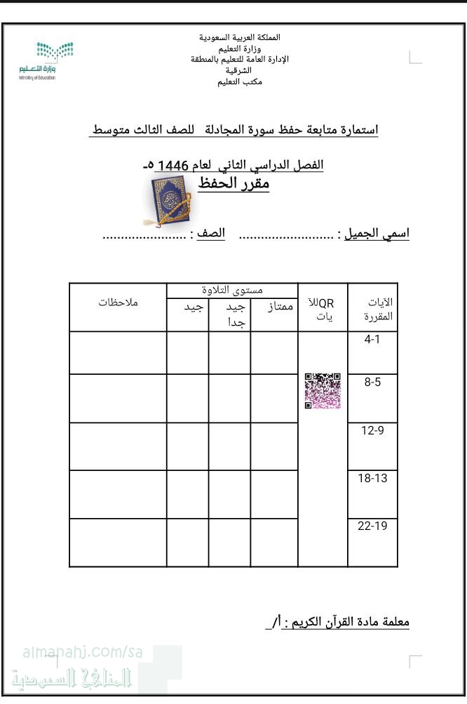 معلومات الملف: استمارة متابعة حفظ سورة المجادلة من مقرر القرآن الكريم ( الحفظ ) للعام 1447ه‍