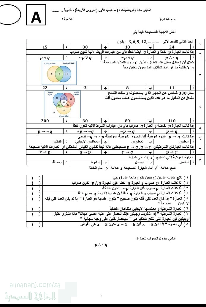 أنت هنا: موقع المناهجالمناهج السعودية الصف الأول الثانوي رياضيات الفصل الأول اختبارات