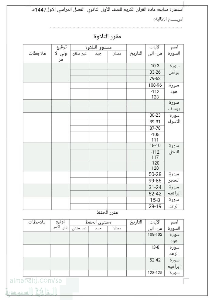 استمارة متابعة القرآن الكريم للعام 1447ه‍
