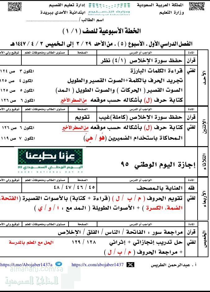 معلومات الملف: الخطة الأسبوعية للأسبوع الخامس من الأحد 923 حتى الخميس 2/4/1447ه من الفصل الأول في مادة القرآن الكريم | ||