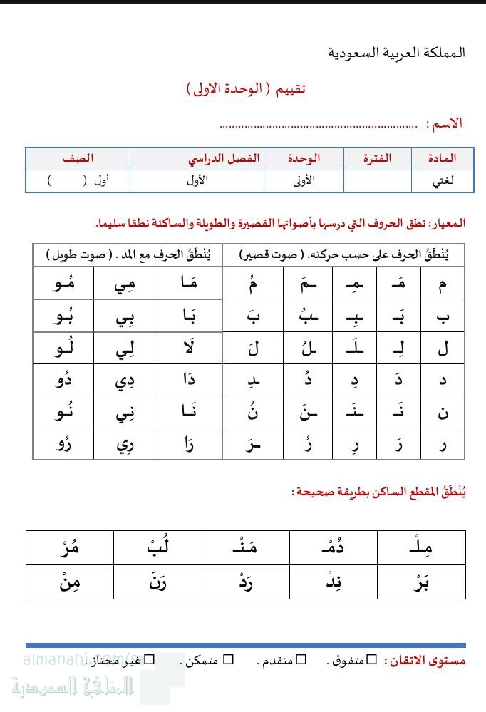 12. الصف الأول, لغة عربية, اختبار لغتي فترة أولى 1447ه