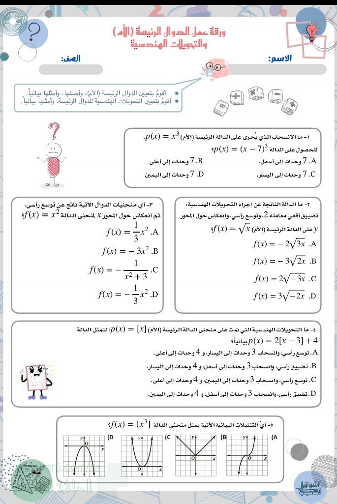 تم إيجاد الملف: ورقة عمل درس الدوال الرئيسية الأم و التحويلات الهندسية