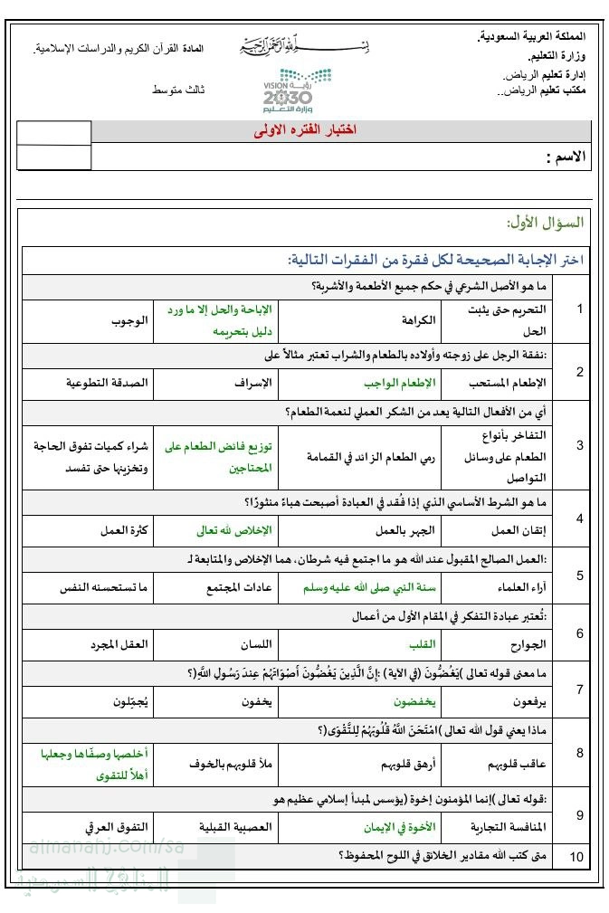 اختبار الفترة الأولى 1447ه‍ مع نموذج الإجابة