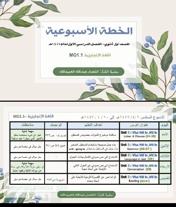 معلومات الملف: الخطة الأسبوعية للأسبوع السادس من الفصل الأول للعام 1447ه‍ لدروس منهج mega goal 1 حيث توزع دروس الوحدة الثالثة what will be, will be على حصص أيام الأسبوع