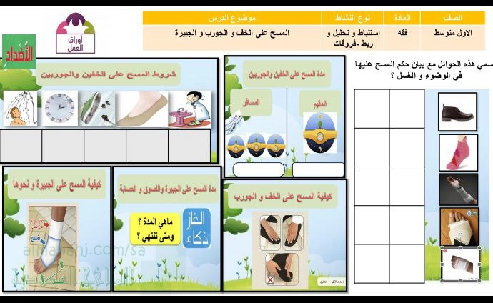 عرض بوربوينت ورقة عمل درس المسح على الخف والجورب والجبيرة فقه