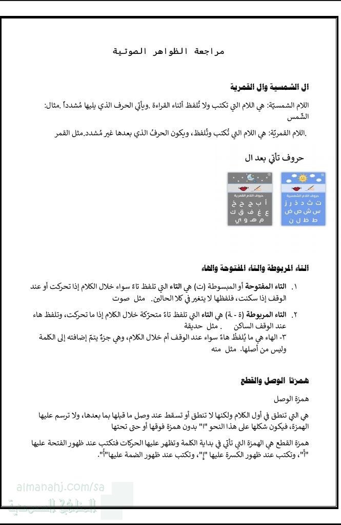 معلومات الملف: مراجعة الظواهر الصوتية في لغتي الجميلة للفصل الأول 1447ه‍ وهي : _ اللام الشمسية و اللام القمرية _ التاء المربوطة و التاء المفتوحة و الهاء _ همزتا الوصل و القطع _ حروف المد _ الألف المقصورة _ التنوين _ المقطع الساكن