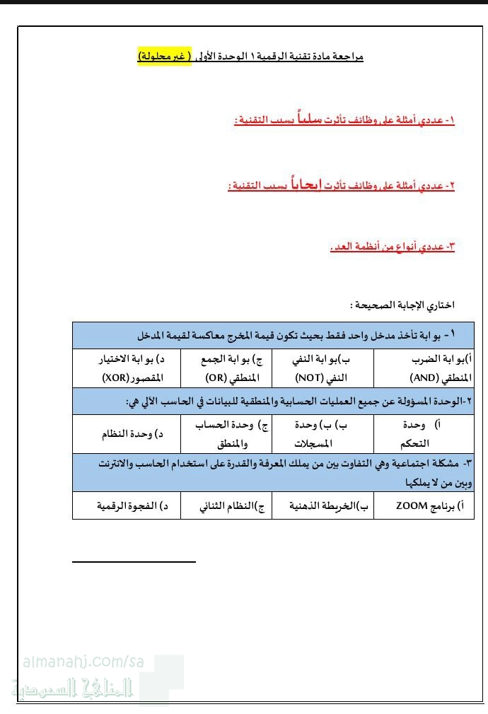 1. أوراق عمل التقنية الرقمية شاملة للفصل الأول1447ه‍