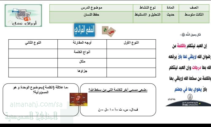 معلومات الملف: ورقة عمل حديث حفظ اللسان من مقرر الإسلامية للفصل الأول 1447ه‍ نوع النشاط المعتمد في الورقة التحليل و الاستنباط تقيس الورقة مهارات الفهم القرائي من خلال المقارنة بين أنواع الكلمة