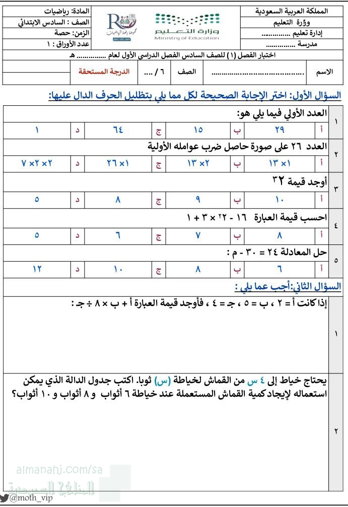 11, رياضيات, اختبار الفصل الأول الأنماط العددية والدوال