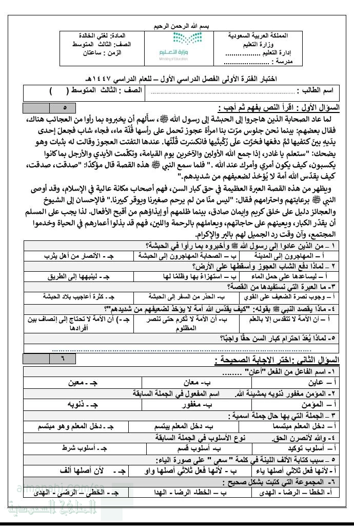 1. لغة عربية, الفصل الأول, 1447_1448, اختبار لغتي للفترة الأولى 1447ه‍