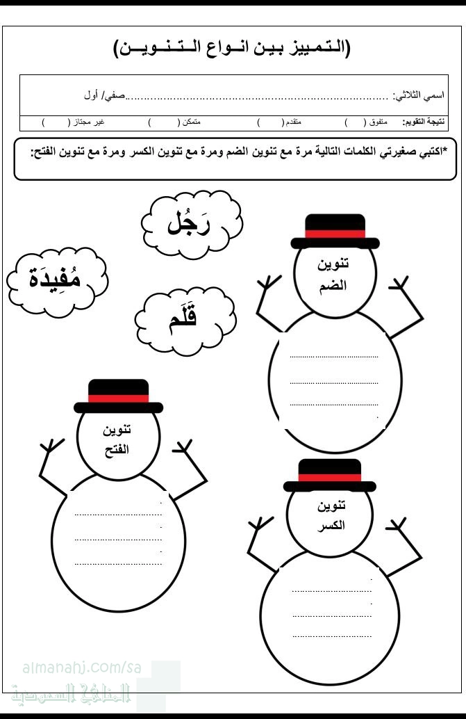 3. الصف الأول, لغة عربية, ورقة تدريب التمييز بين أنواع التنوين