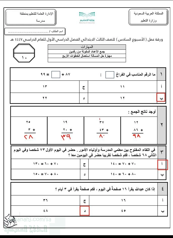 معلومات الملف: نموذج الإجابة على ورقة عمل الأسبوع السادس من الفصل الأول 1447ه‍ نموذج بورقة واحدة ، والتي تستهدف المهارات التالية : _ جمع الأعداد المكونة من رقمين _ مهارة حل المسألة استعمال الخطوات الأربع