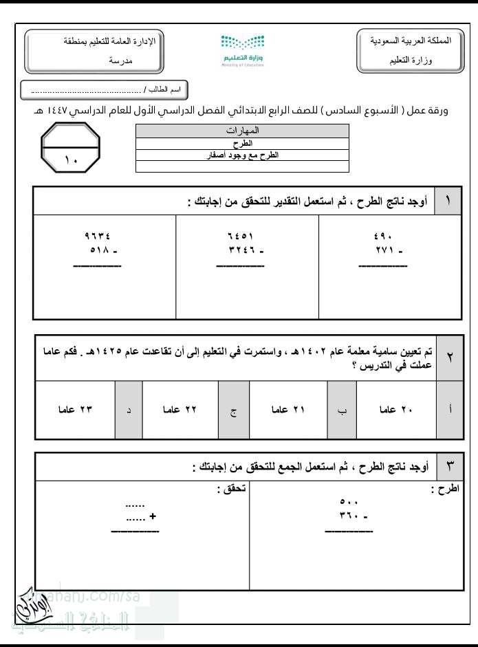معلومات الملف: ورقة عمل الأسبوع السادس من الفصل الأول نموذج بورقة واحدة تستهدف المهارات التالية: _ الطرح _ الطرح مع وجود أصفار | ||