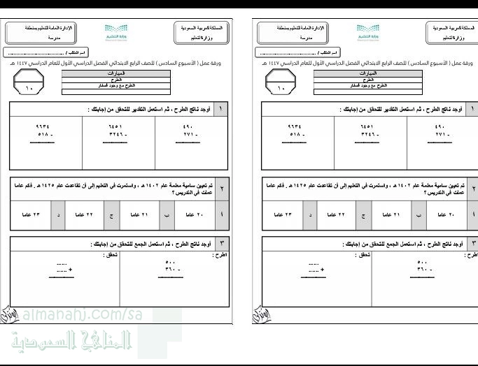 معلومات الملف: ورقة عمل الأسبوع السادس نموذجين بورقة واحدة للفصل الأول من العام 1447ه‍ من دون حل المهارات المستهدفة : الطرح الطرح مع وجود أصفار