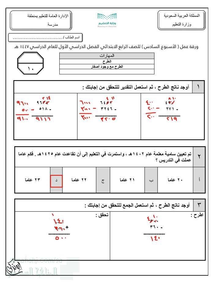 11. الصف الرابع, رياضيات, ورقة عمل للأسبوع السادس نموذج بورقة واحدة 1447ه