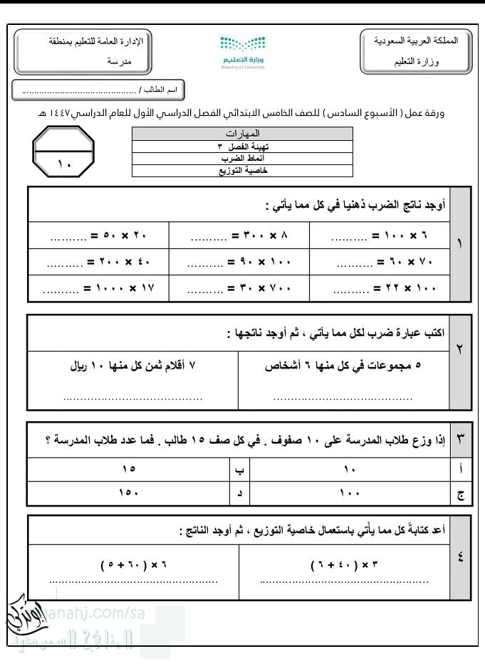 معلومات الملف: ورقة عمل الأسبوع السادس نموذج بورقة واحدة للفصل الأول من العام 1447ه‍ المهارات المستهدفة فيها : _ تهيئة الفصل الثالث _ أنماط الضرب _ خاصية التوزيع