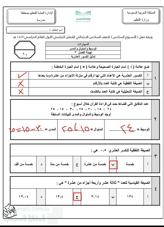 معلومات الملف: نموذج الحل لورقة العمل للأسبوع السادس من الفصل الأول 1447ه نموذج بورقة واحدة . المهارات المستهدفة: _الوسيط و المنوال و المدى _ تهيئة الفصل الثالث _ تمثيل الكسور العشرية | ||
