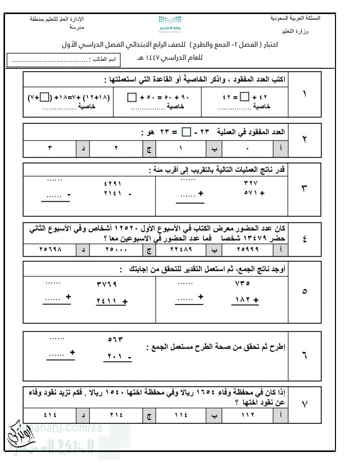 معلومات الملف: نموذج اختبار الفصل الثاني من مقرر رياضيات الفصل الأول 1447ه‍ الجمع و الطرح الأسئلة متنوعة و شاملة لدروس الفصل: التهيئة ، خصائص الجمع، تقدير المجموع و الفرق ، قواعد الطرح، مهارة حل المسألة، استكشاف الطرح، الطرح مع وجود أصفار