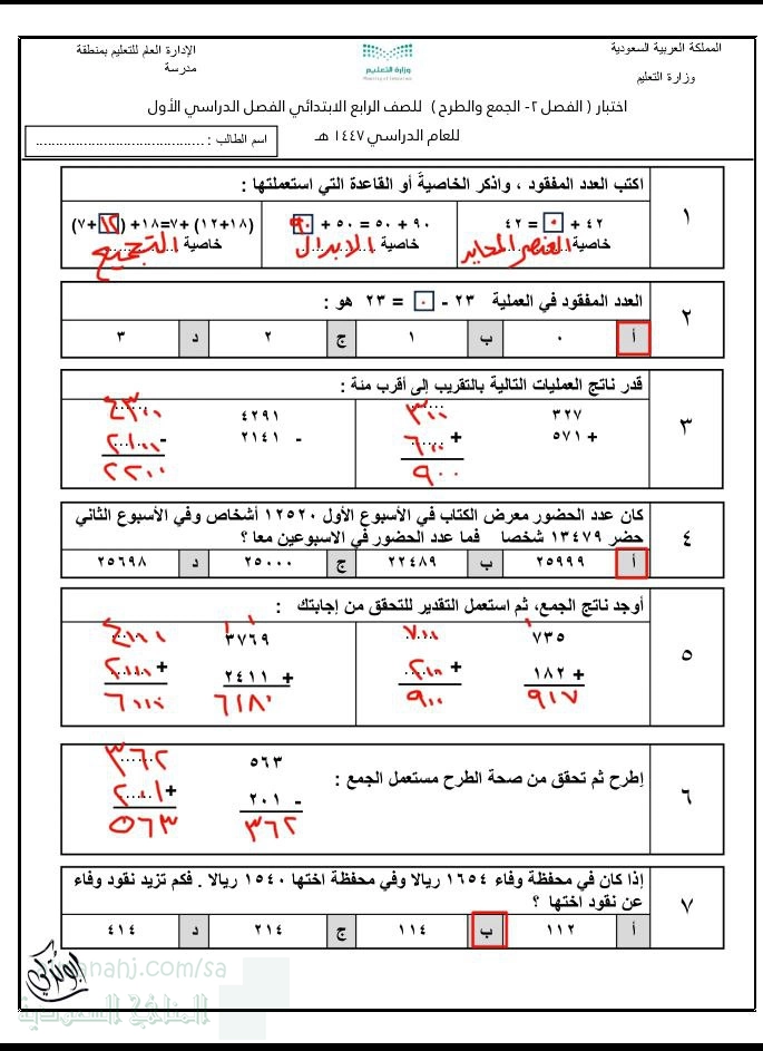تم إيجاد الملف: نموذج الإجابة على اختبار فصل الجمع و الطرح