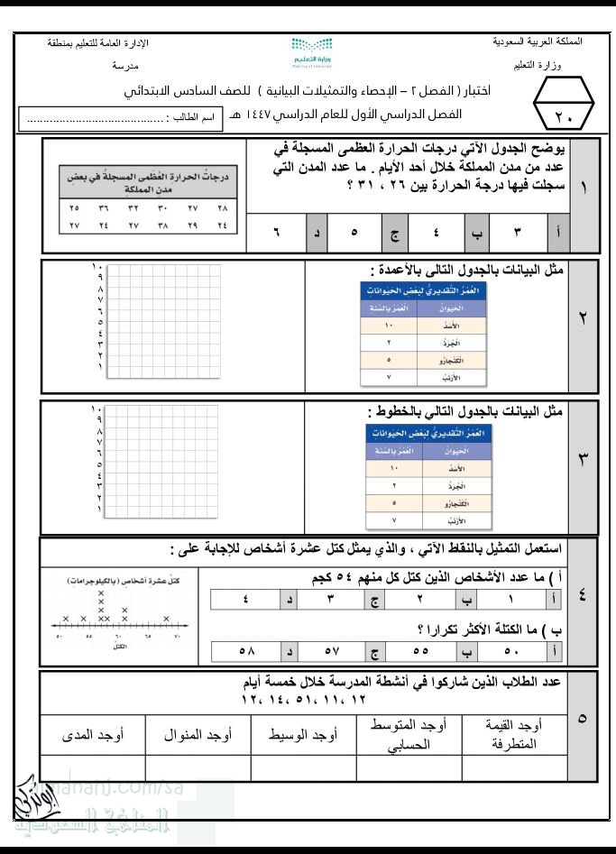 معلومات الملف: اختبار الفصل الثاني من مقرر رياضيات الفصل الأول 1447ه‍ الإحصاء والتمثيلات البيانية دروس الفصل: التهيية، خطة حل المسألة، إنشاء جدول التمثيل بالأعمدة و الخطوط التمثيل بالنقاط، المتوسط الحسابي، الوسيط و المنوال و المدى