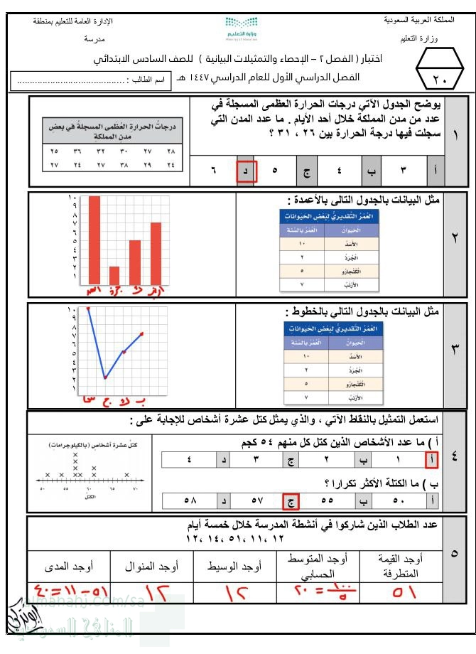 معلومات الملف: نموذج الإجابة على اختبار الفصل الثاني من مقرر رياضيات الفصل الأول 1447ه‍ الإحصاء والتمثيلات البيانية الذي قدمناه في ملفنا السابق والذي يتضمن الدروس التالية: التهيية خطة حل المسألة إنشاء جدول التمثيل بالأعمدة و الخطوط التمثيل بالنقاط، المتوسط الحسابي الوسيط و المنوال و المدى