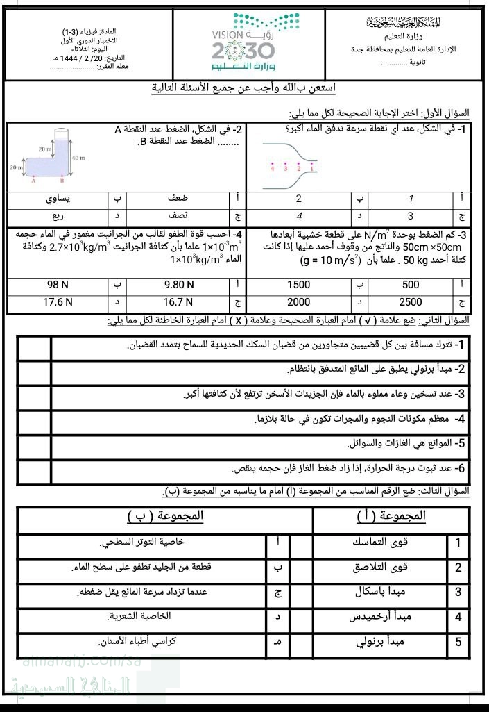 2. فيزياء, الفصل الأول, 1447_1448, اختبار الفترة الدور الأول 1447ه‍