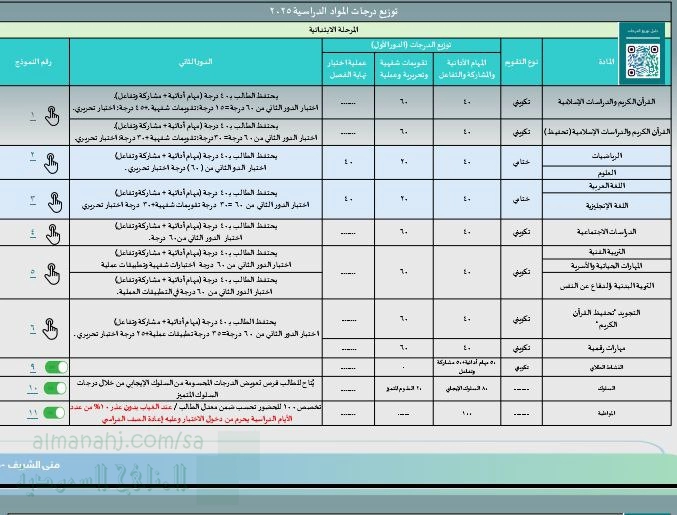 معلومات الملف: توزيع درجات المواد الدراسية للعام 1447ه‍/2025م لجميع المراحل الدراسية الإبتدائية و المتوسطة و الثانوية وجميع المواد مع نوع التقويم ، المهام الأدائية و المشاركة و التفاعل ، تقويمات شفهية تحريرية عملية اختبار نهاية الفصل للدورين الأول و الثاني