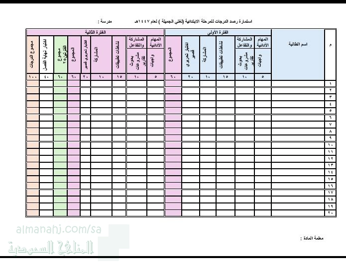 معلومات الملف: استمارة رصد درجات لغتي الجميلة للمرحلة الإبتدائية الصفوف الأولية الأول و الثاني و الثالث للفصل الأول من العام 1447ه‍ تشمل الاستمارة: المهام الأدائية المشاركة و التفاعل اختبار تحرير قصير للفترتين الأولى و الثانية