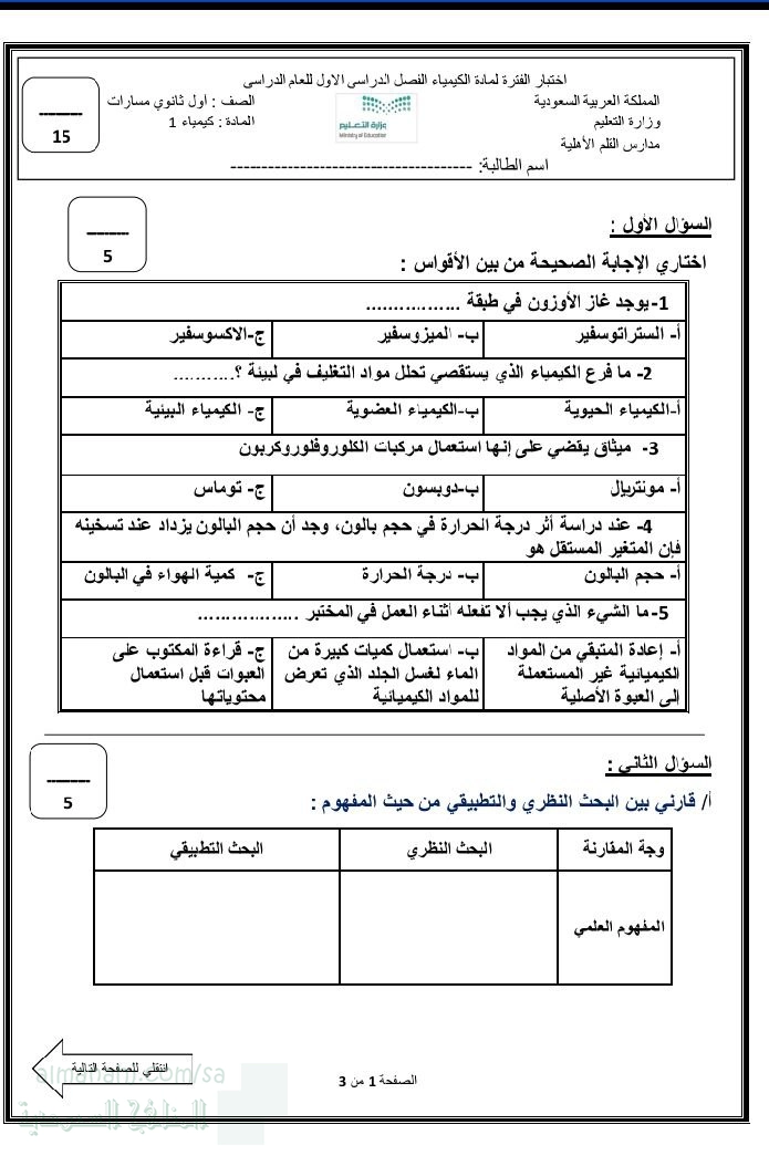 1. كيمياء, الفصل الأول, 1447_1448, اختبار الفترة الأولى كيمياء مسارات 1447ه‍