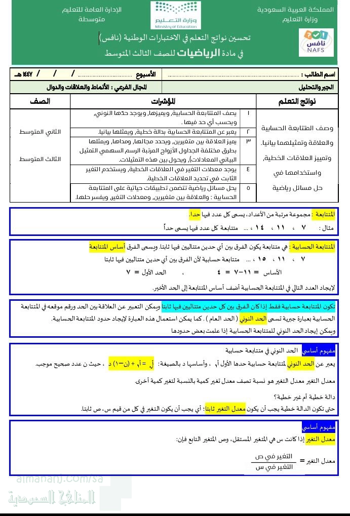 معلومات الملف: التدريب السابع لتحسين نواتج التعلم في الاختبارات الوطنية نافس في مجال الرياضيات للصفين الثاني و الثالث المتوسط ، المجال الفرعي: الأنماط و العلاقات و الدوال نواتج التعلم : _ وصف المتابعة الحسابية والعلاقة و تمثيلها بيانياً و تمييز العلاقات الخطية و استخدامها في حل مسائل رياضية