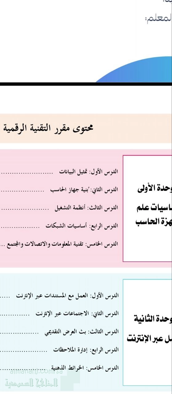 معلومات الملف: مراجعة محلولة شاملة لدروس الوحدة الأولى من مادة التقنية الرقمية أساسيات علم الحاسب ، التي تشمل الدروس التالية: _ تمثيل البيانات _ بنية نظام الحاسب _ أنظمة التشغيل _ أساسيات الشبكات _ تقنية المعلومات و الاتصالات و المجتمع