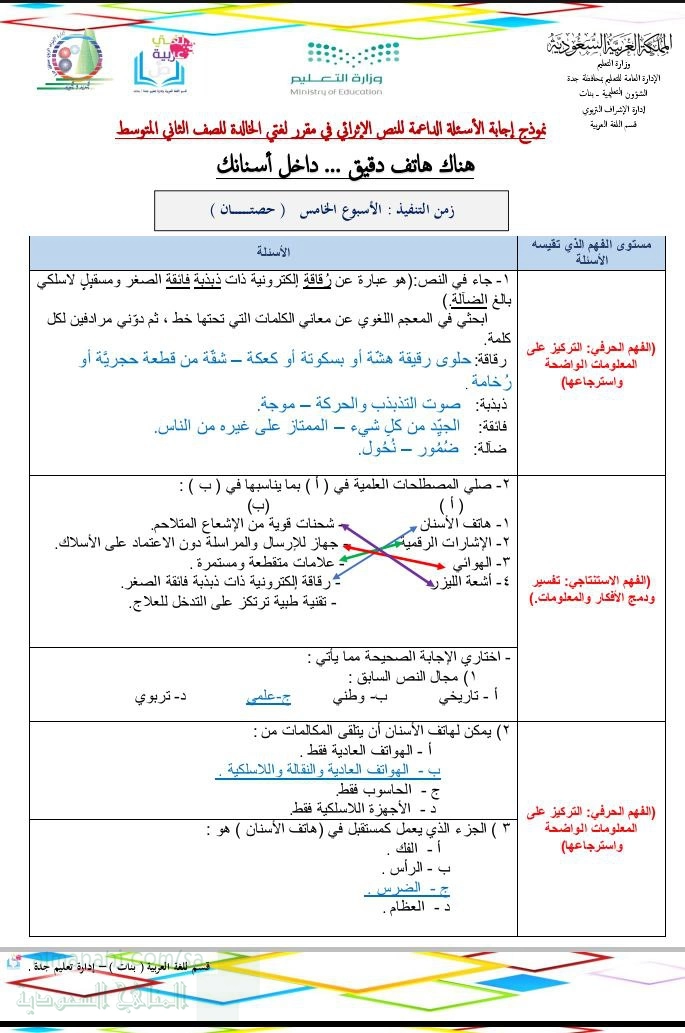معلومات الملف: نموذج إجابة الأسئلة الداعمة للنص الإثرائي هناك هاتف دقيق داخل أسنانك في مقرر لغتي الخالدة ، مستوى الفهم الذي تقيسه الأسئلة : _ الفهم الحرفي : التركيز على المعلومات الواضحة واسترجاعها _ الفهم الاستنتاجي تفسير و دمج الأفكار و المعلومات _ الفهم الإبداعي الناقد دراسة و تقييم المحتوى و اللغة و العناصر النصية _ الفهم التفسيري تكوين الاستدلالات المباشرة _ دراسة و تقييم المحتوى و اللغة والعناصر النصية